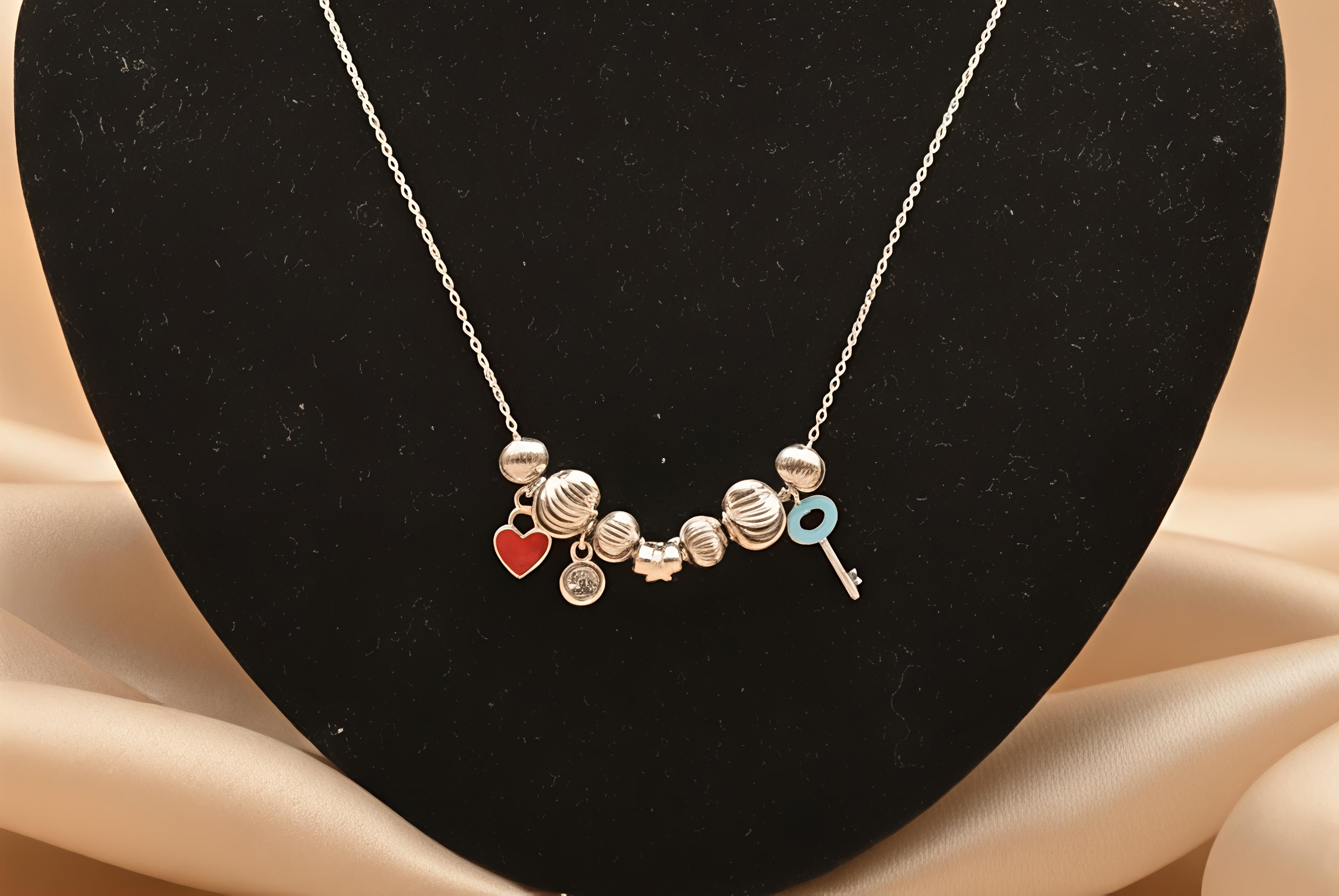 Elevate your jewelry collection with this premium 92.5 Sterling Silver fancy chain. Featuring a delightful combination of textured silver beads and vibrant charms, this piece is designed for those who love a blend of modern elegance and playful sophistication.