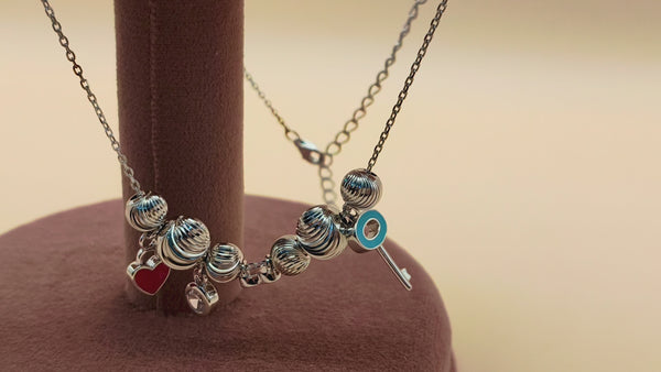 Design: A stylish beaded chain adorned with unique charms, including a Red Heart, a Sky Blue Key, and a Sparkling Crystal Drop, offering a chic and trendy look.