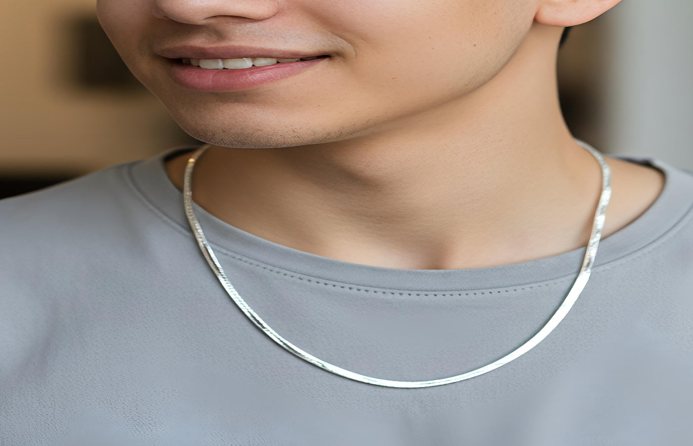 Man wearing a silver necklace against a neutral background