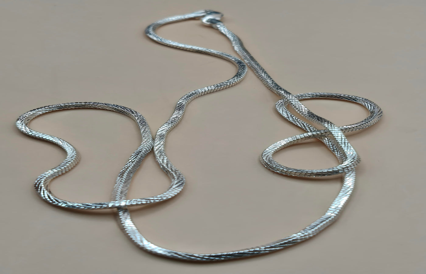 Silver snake chain necklace on a beige background