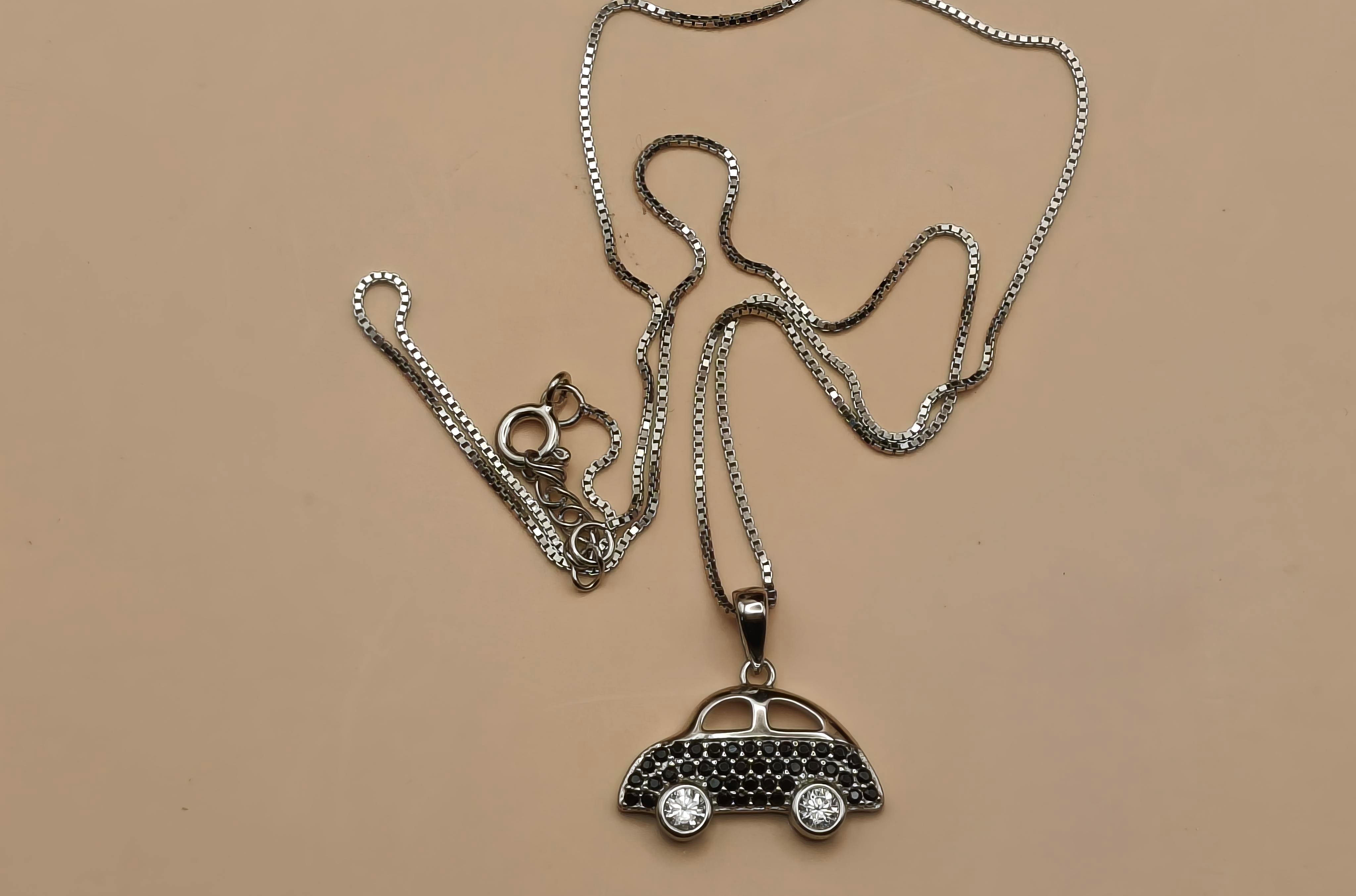 Design: A stylish and bold vintage car pendant with intricate stone detailing and a polished silver-tone finish.