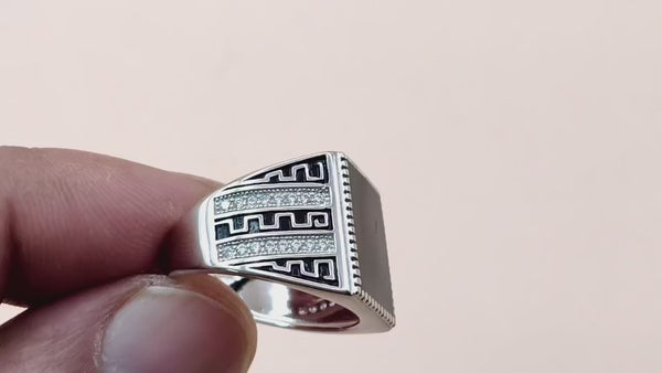 Elevate your personal style with a blend of modern sophistication and timeless craftsmanship. This exquisite gents' ring features a bold, rectangular black onyx centerpiece, meticulously set within a high-quality 92.5 Sterling Silver frame. The band is intricately detailed with a unique interlocking geometric pattern, accented with rows of sparkling precision-set stones that catch the light from every angle.