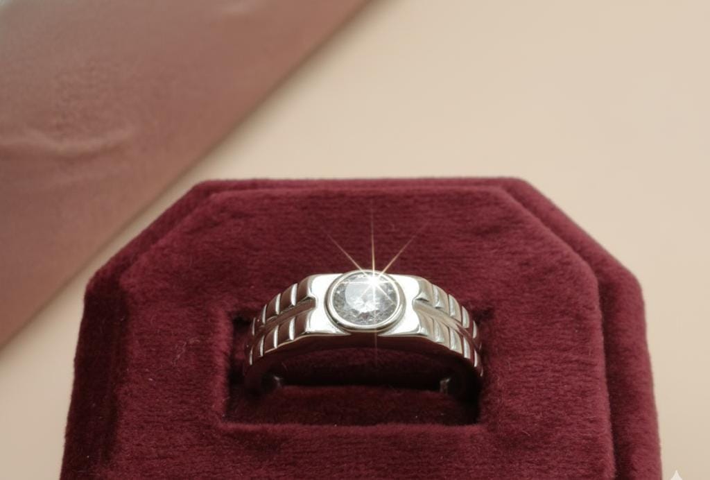 Elevate your personal style with a blend of modern sophistication and timeless craftsmanship. This exquisite gents' ring features a brilliant, precision-cut solitaire stone, meticulously set within a sleek 92.5 Sterling Silver band. The band is uniquely designed with a textured, architectural pattern that adds a touch of masculine luxury to your hand.