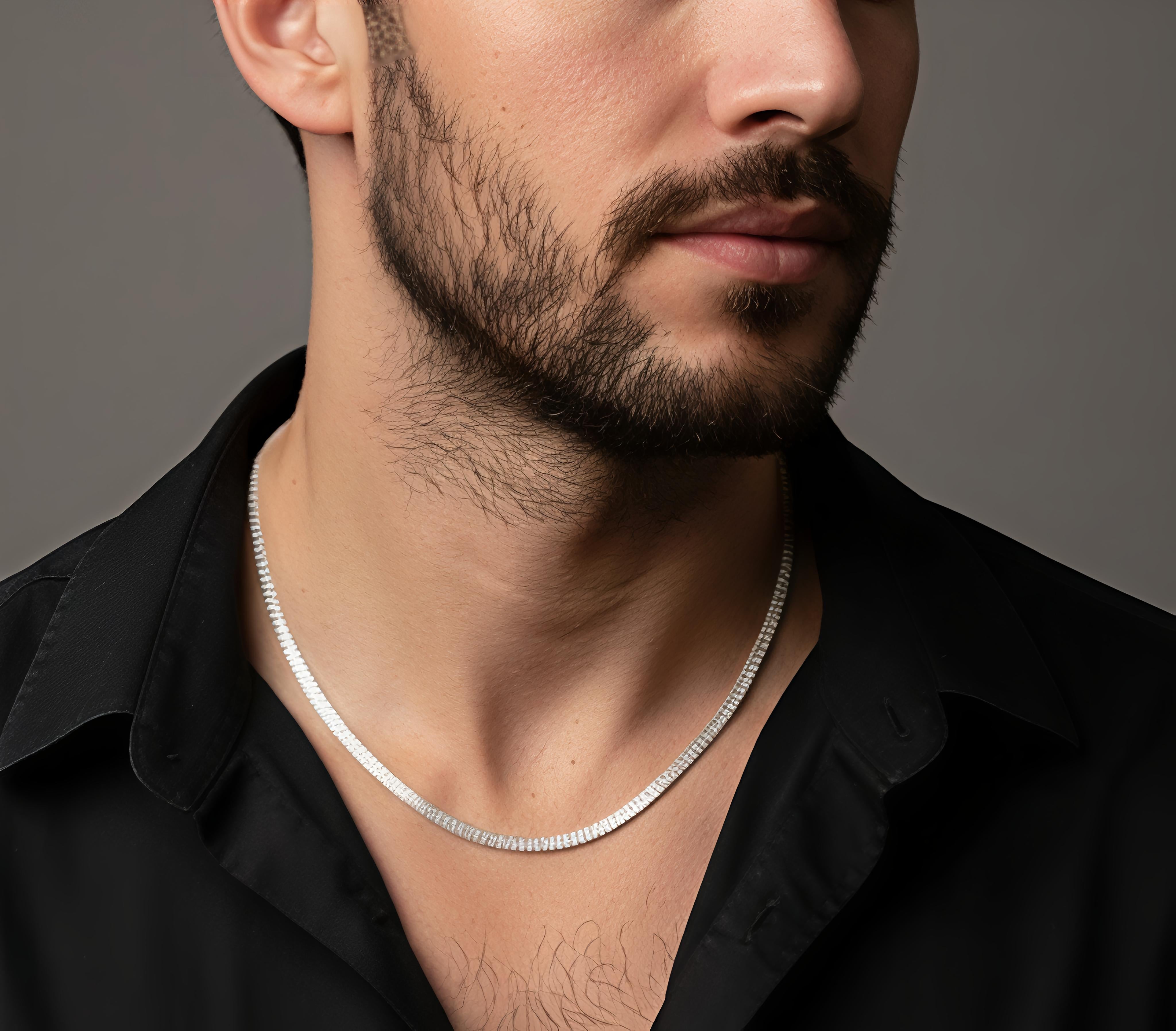 Design: A sleek and masculine flat-link (Herringbone style) pattern that sits comfortably against the skin, offering a smooth and luxurious feel.
