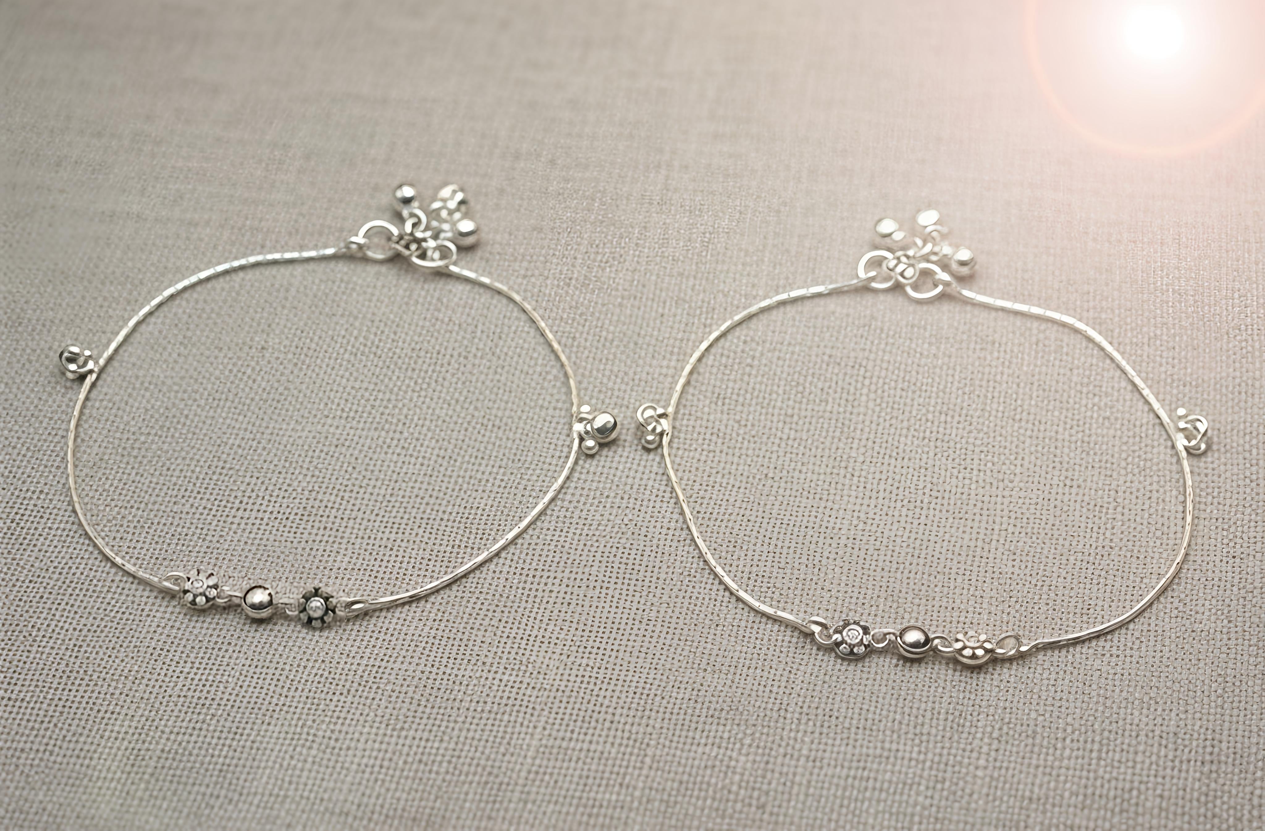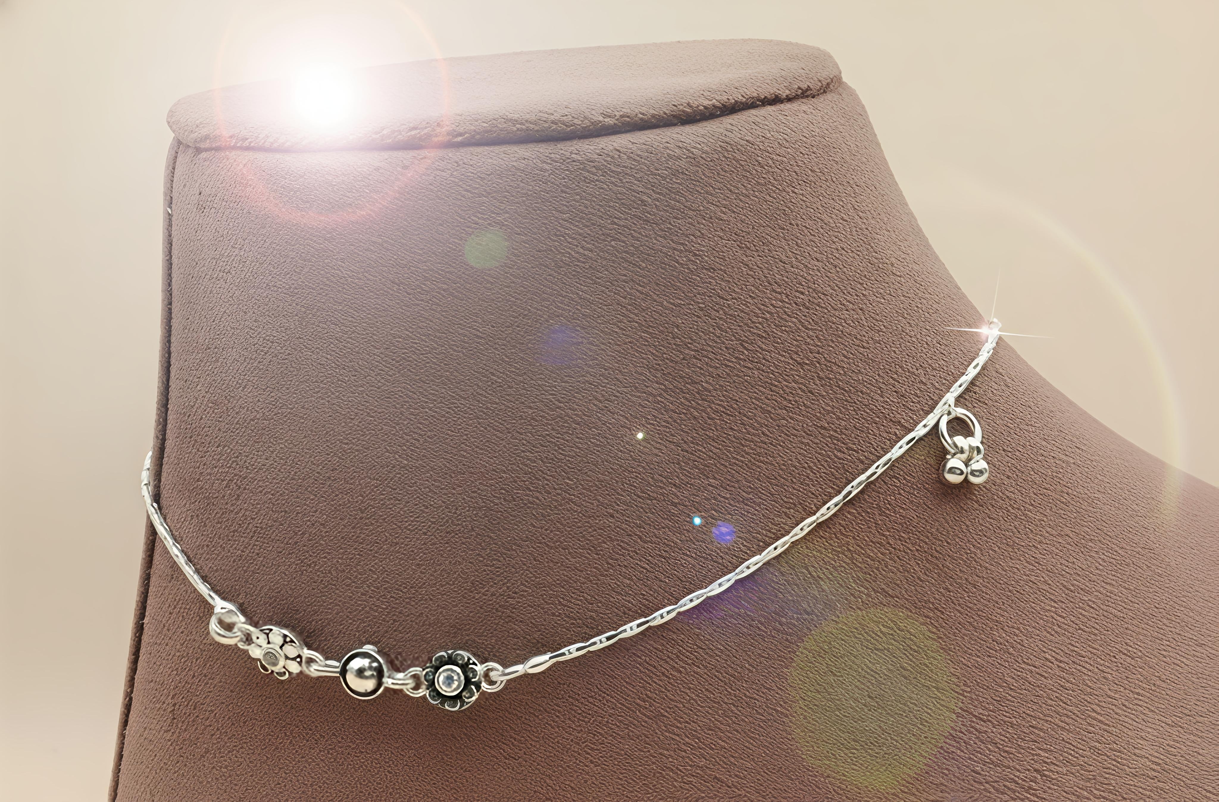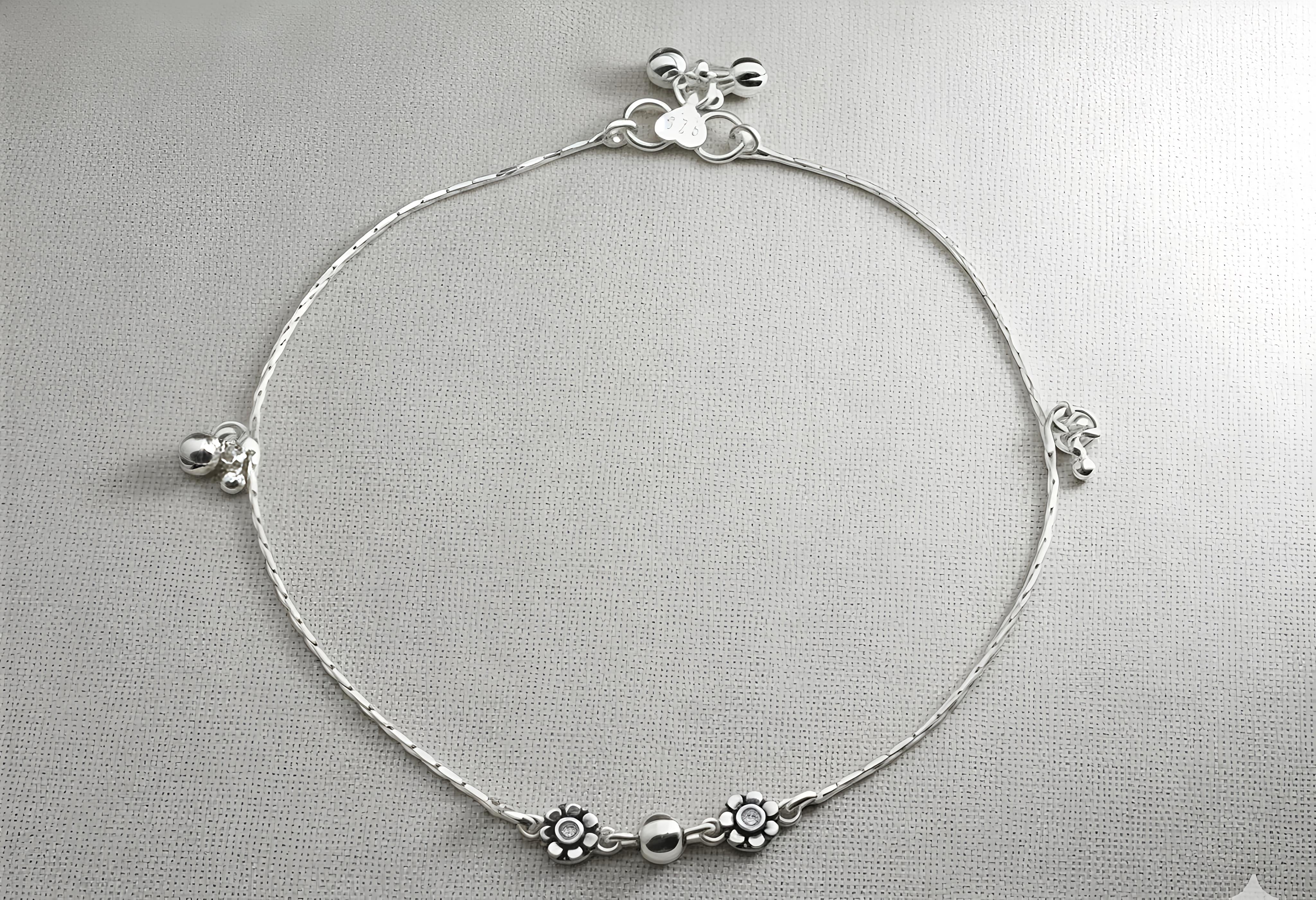 Elevate your everyday style with this stunning silver anklet, crafted from authentic 92.5 Sterling Silver. This piece beautifully blends traditional craftsmanship with a modern aesthetic, featuring delicate floral charms and elegant silver accents.