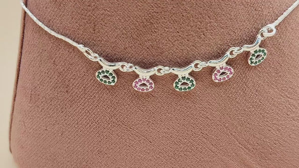 Elevate your everyday style with this stunning handcrafted anklet, designed to add a touch of grace to your every step. This piece beautifully blends artistic craftsmanship with a modern aesthetic, featuring vibrant stone-studded charms and elegant silver curves.