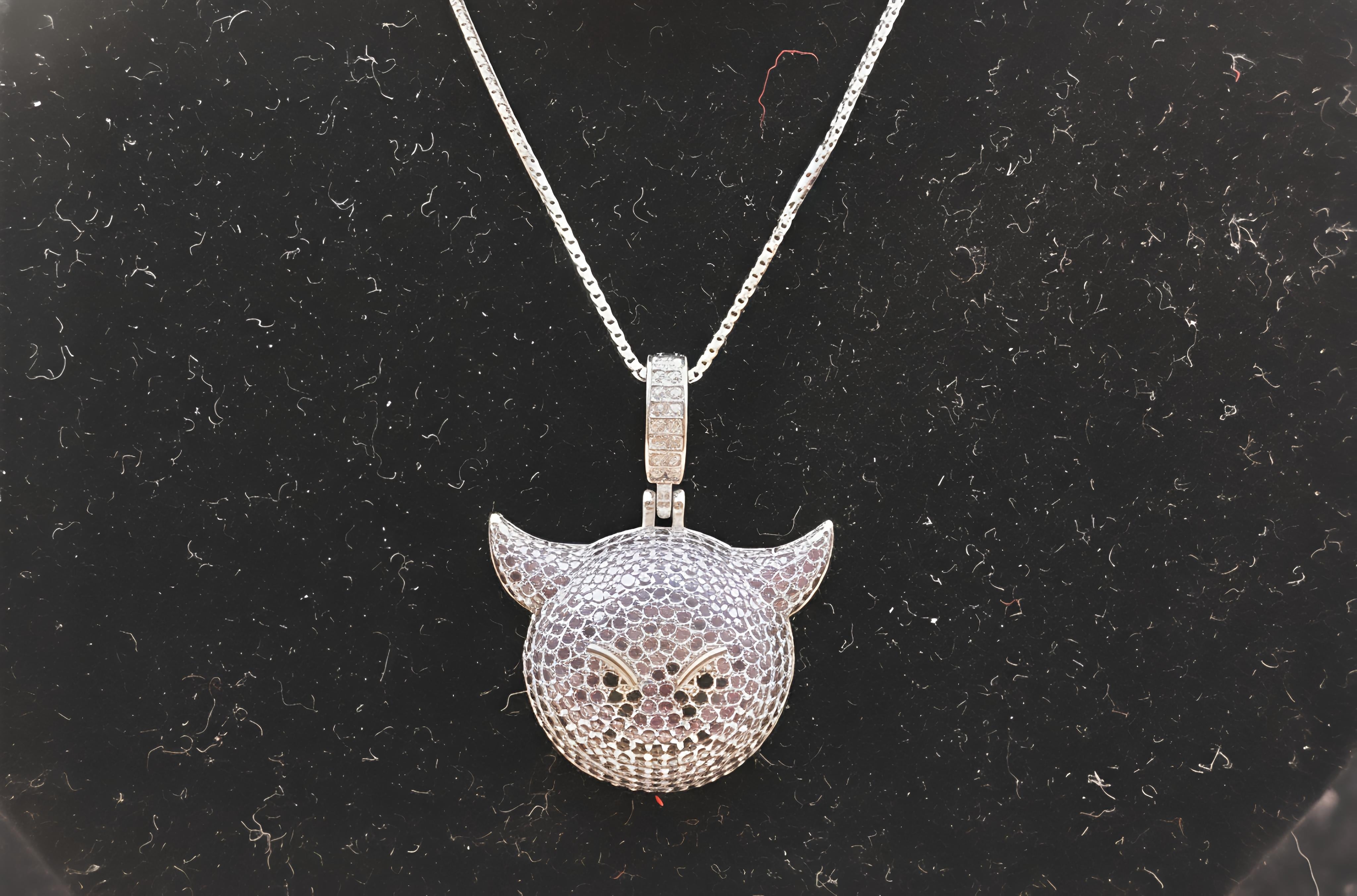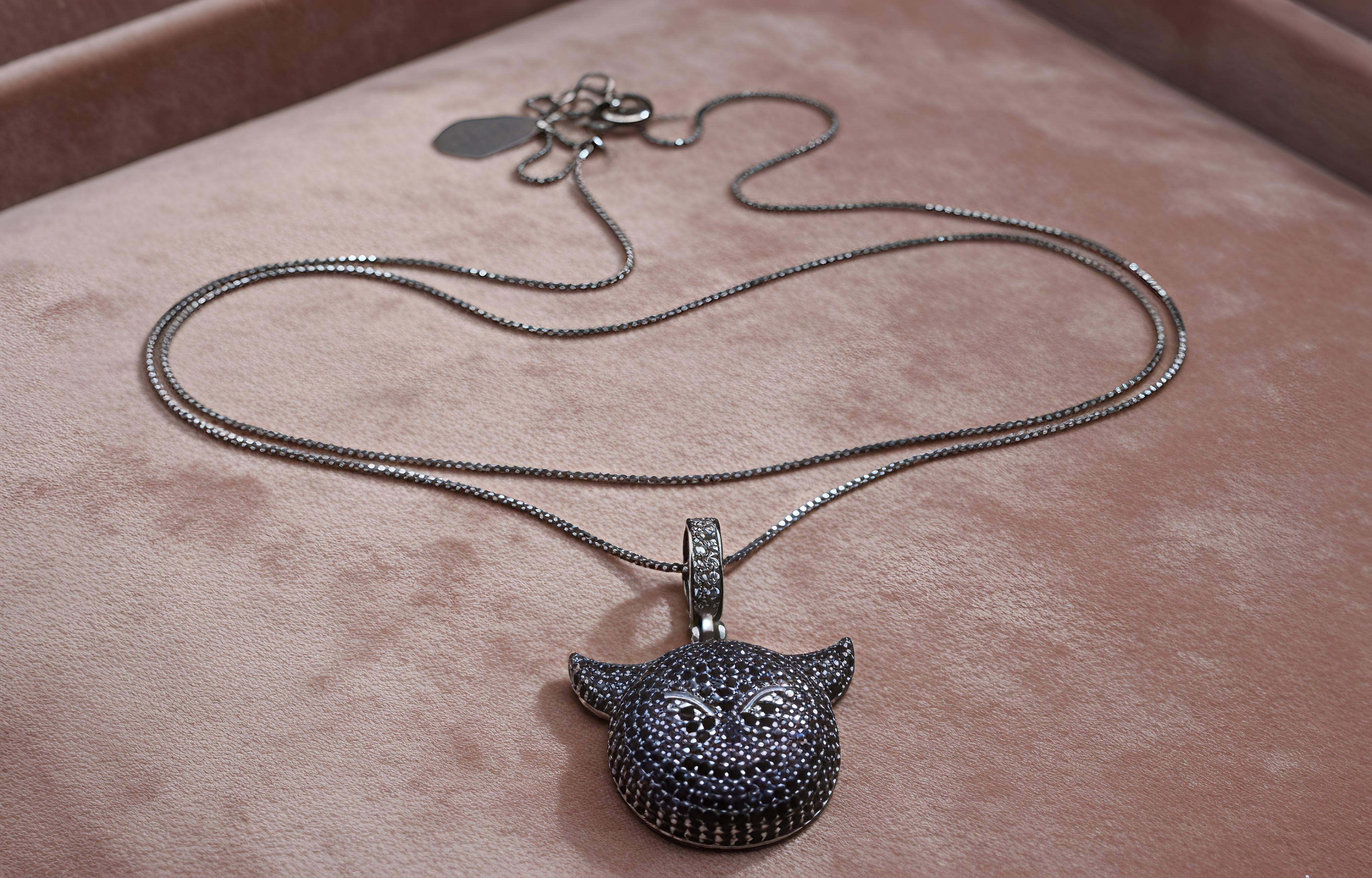 Design: A stylish and bold devil-head pendant with intricate stone detailing and a polished silver-tone finish.