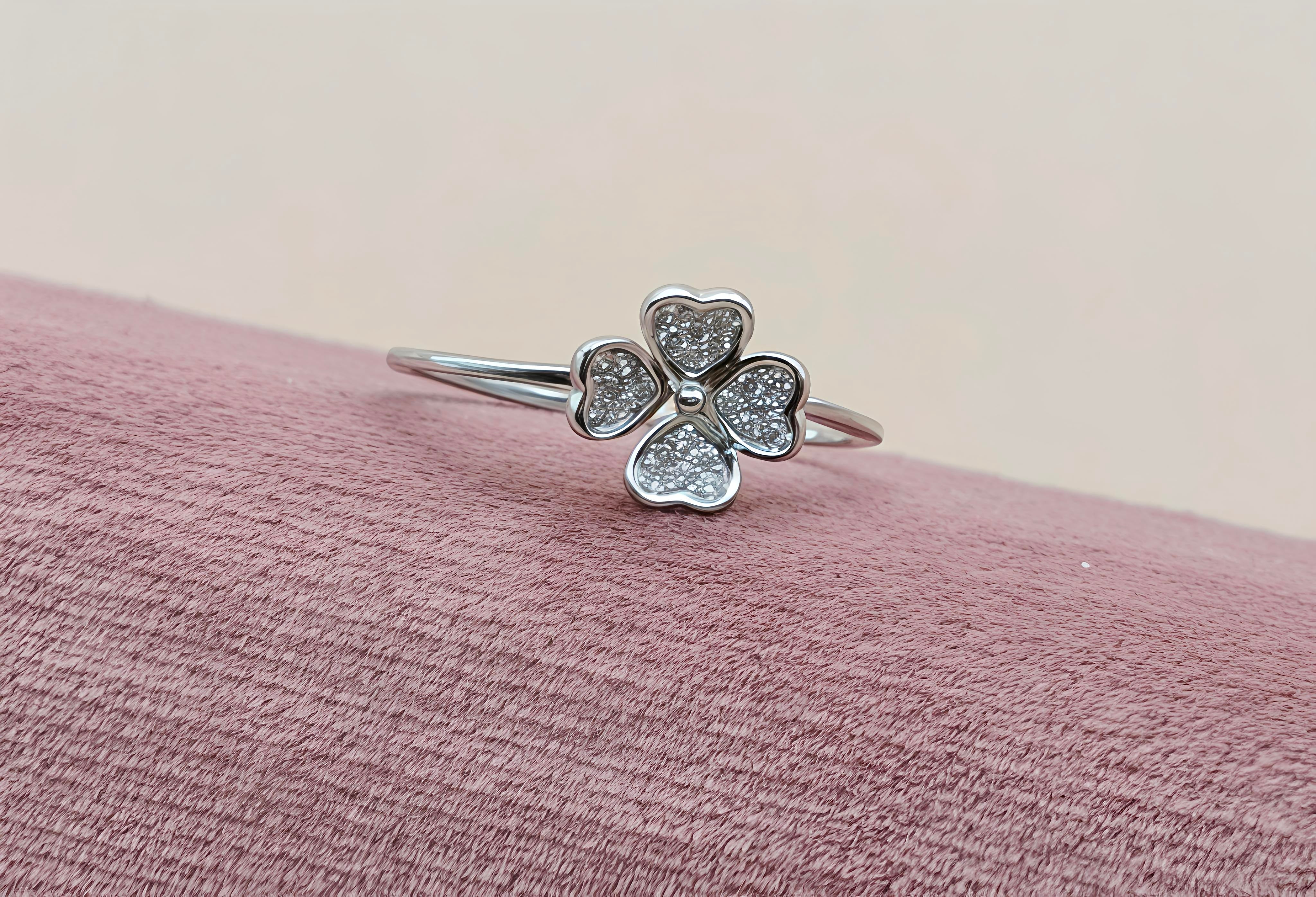 Bring a touch of luck and elegance to your everyday style with this charming four-leaf clover ring. This delicate piece features four heart-shaped petals, each meticulously studded with shimmering stones to create a brilliant sparkle. Its minimalist design makes it a versatile accessory that radiates grace and positivity.