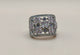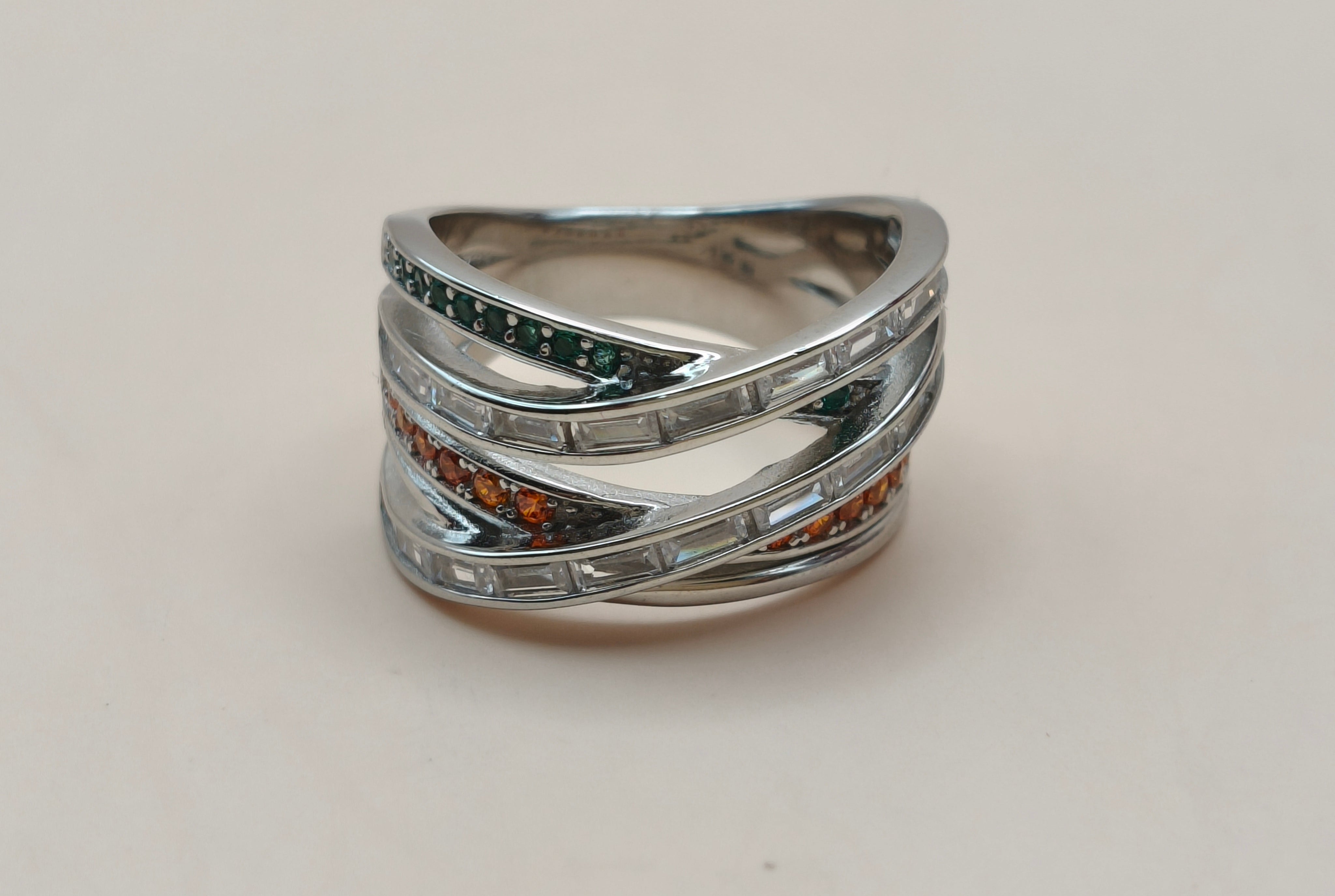 Make your jewelry collection look better with this beautiful multi-band ring. It has a stylish crossover design that mixes shiny silver with rows of sparkling stones. The design features a vibrant mix of emerald green and amber orange stones alongside sleek white baguettes, creating a look that is both modern and royal.
