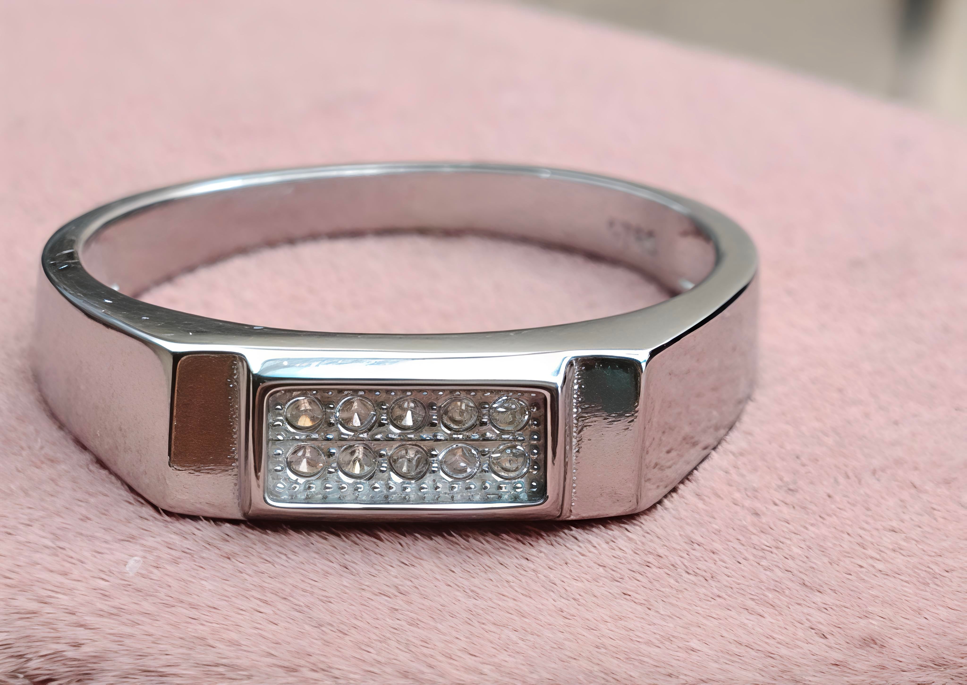 Elevate your everyday look with this sophisticated gents' ring, designed for the man who appreciates subtle luxury. This piece features a refined rectangular face pave-set with rows of brilliant stones, meticulously crafted from premium 92.5 Sterling Silver. The sleek, tapered band ensures a comfortable fit while maintaining a bold, masculine presence.