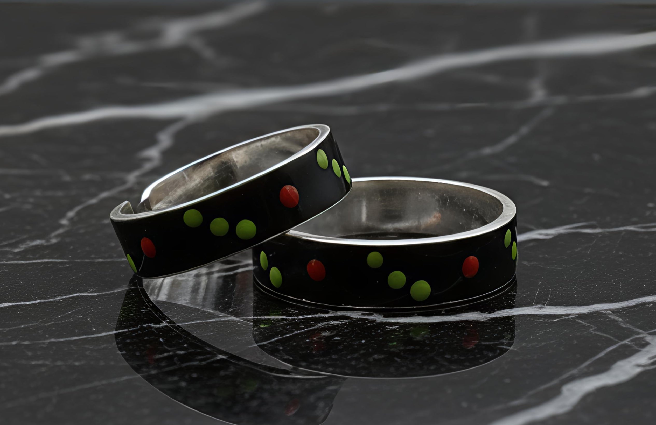 - Design: Sleek black enamel with vibrant red and green polka dot accents