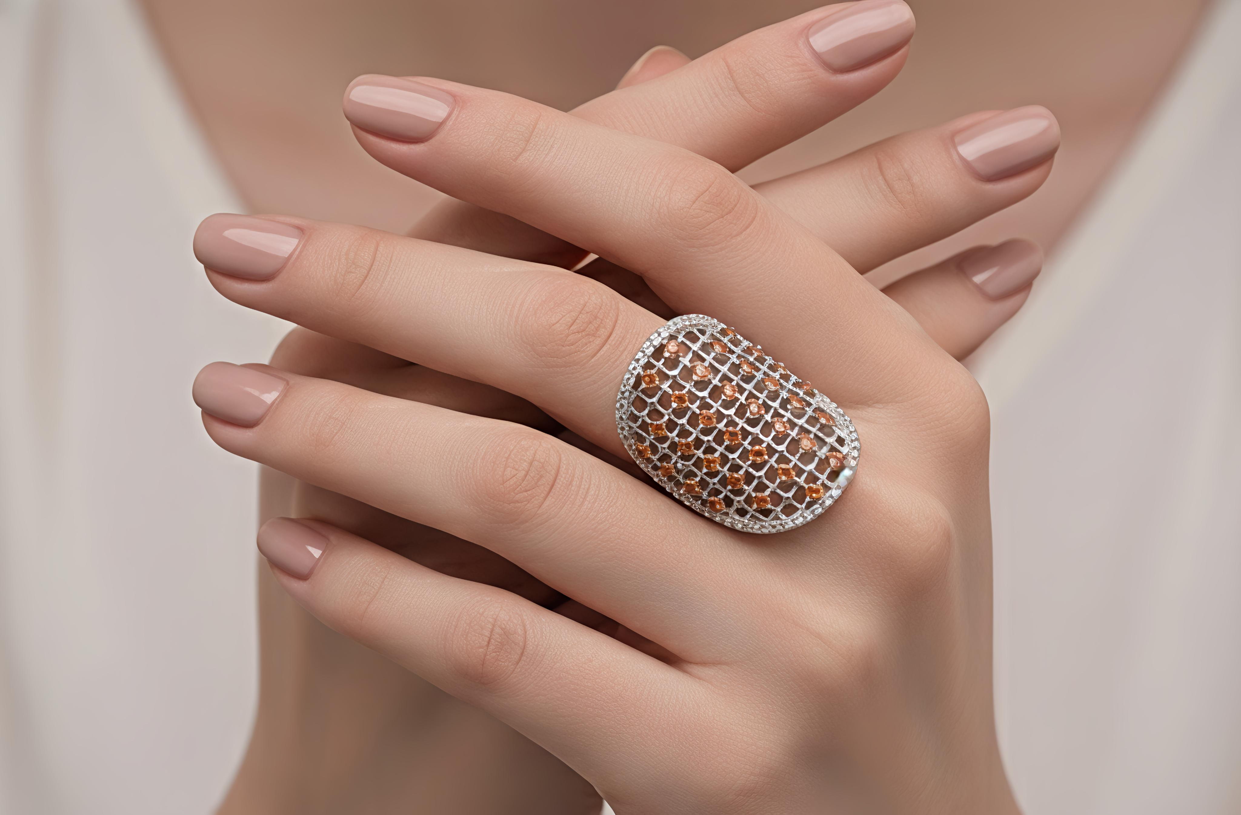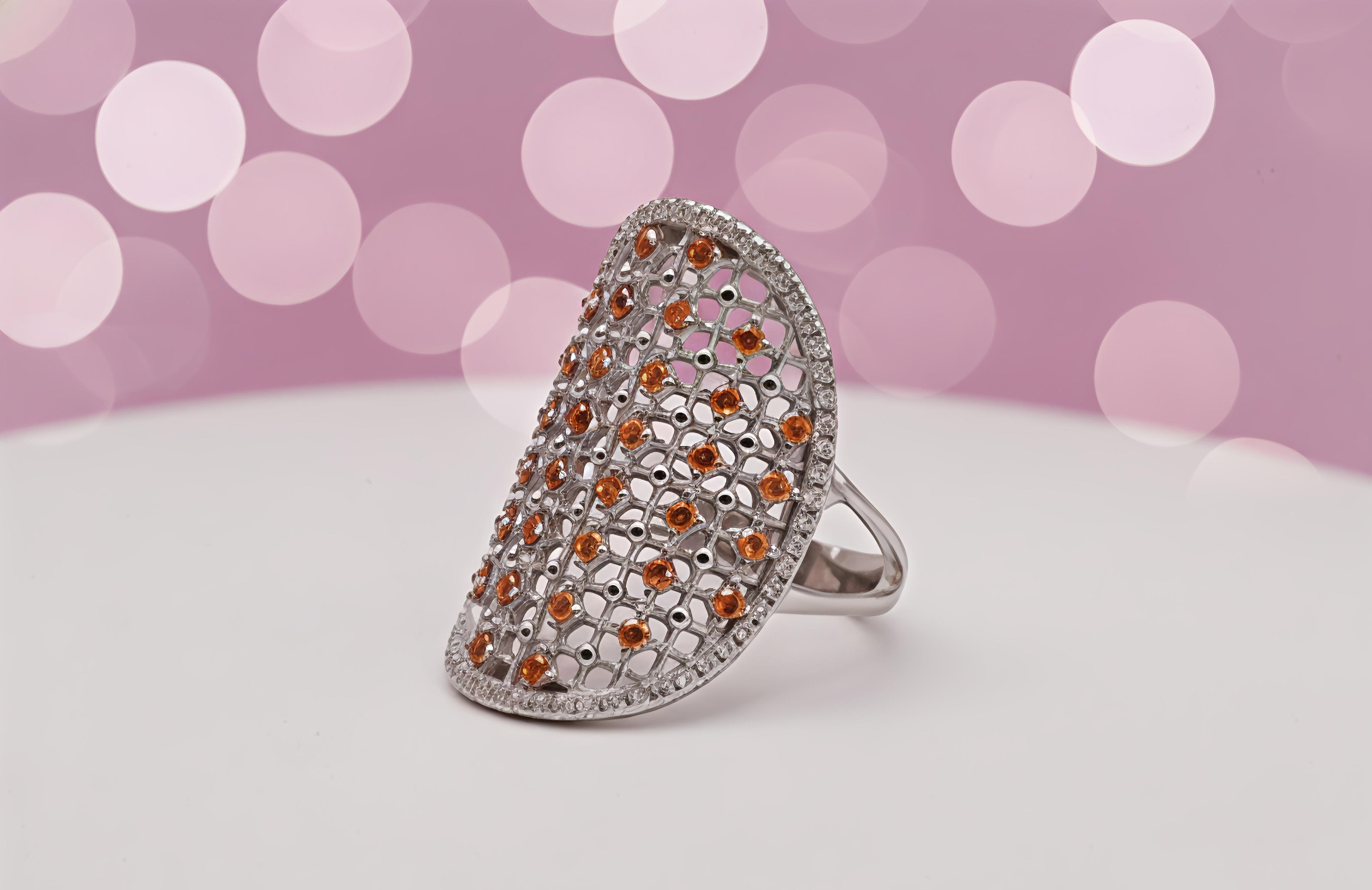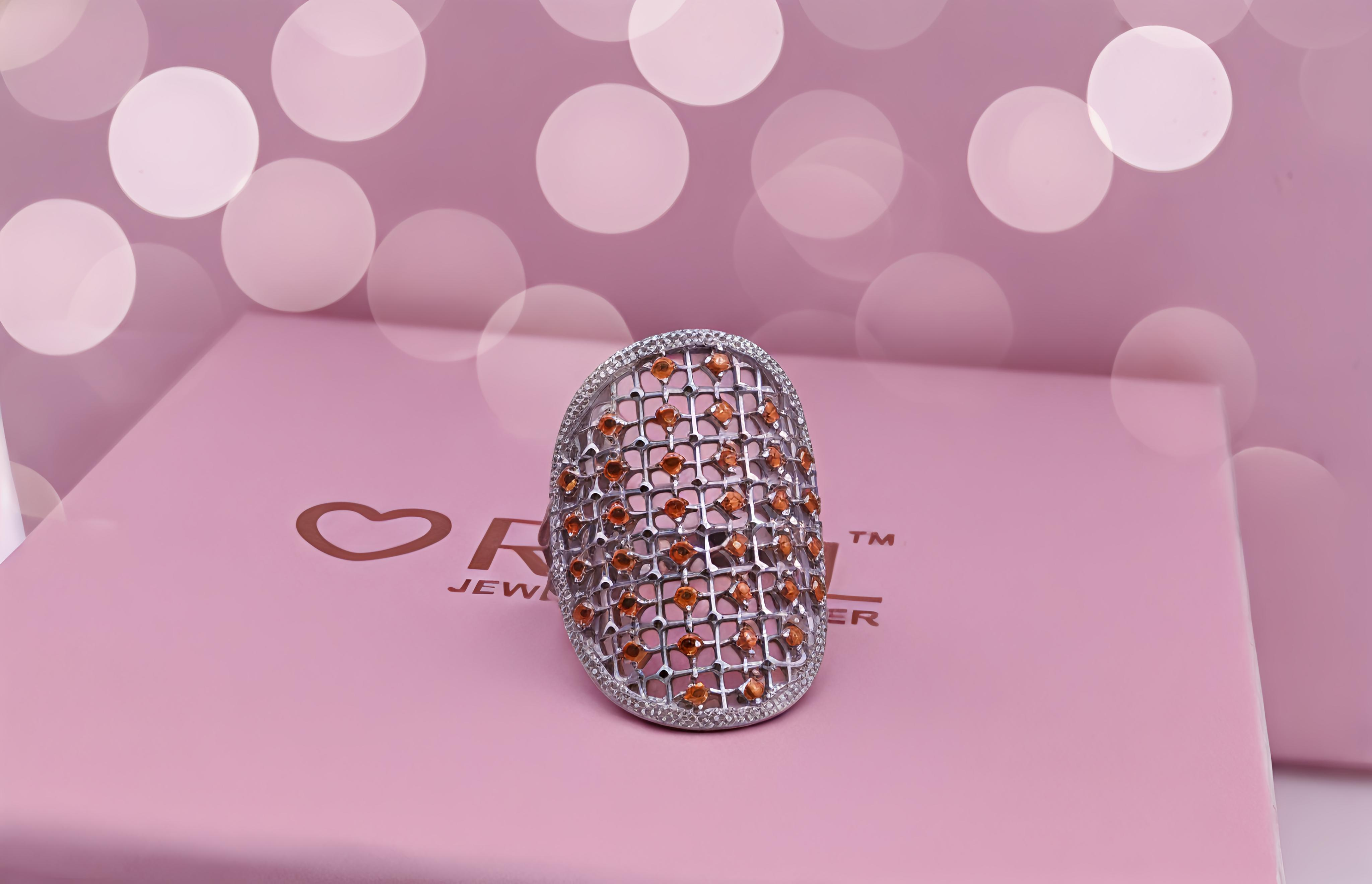 Elevate your collection with this exquisite handcrafted ring, featuring a distinctive elongated shield design. The intricate silver lattice is meticulously set with vibrant orange stones and framed by a shimmering border of white crystals.