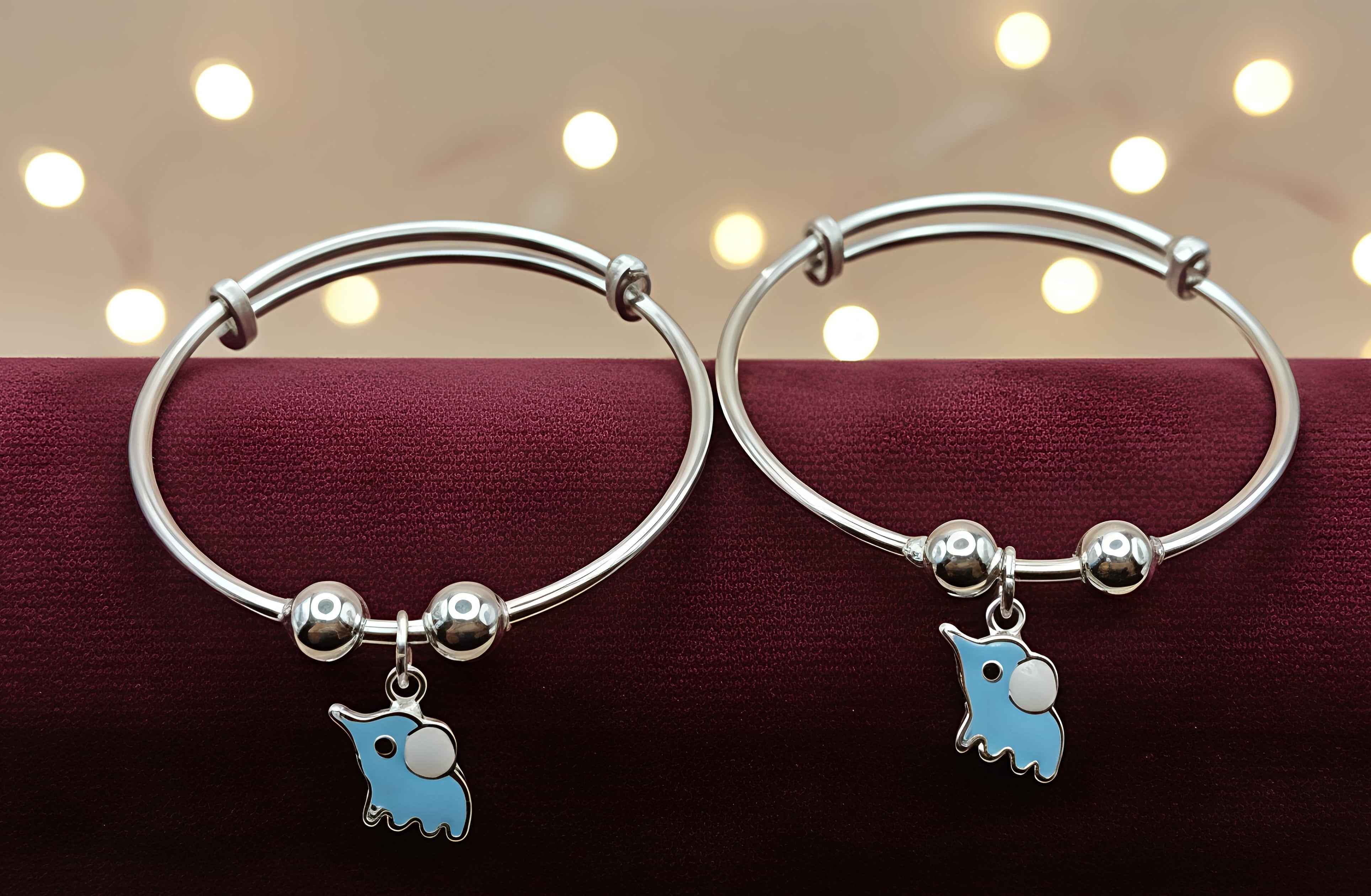 92.5 Sterling Silver Adjustable Baby KadaTwo silver bangles with blue elephant charms on a dark surface with blurred lights in the background.Silver bangle with blue bird charms on a marble surfaceSilver bangle with blue elephant charms on a soft surface with blurred lights in the background