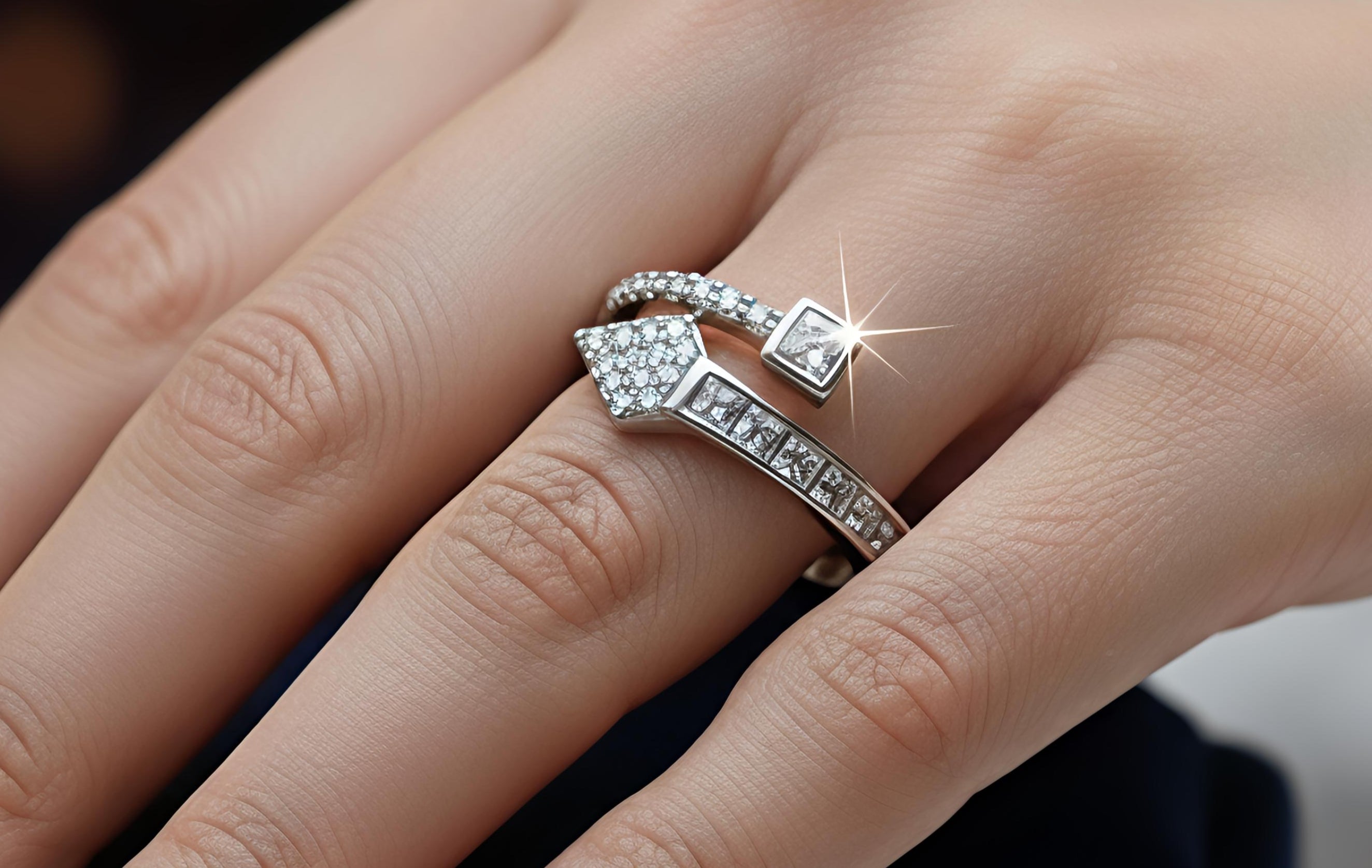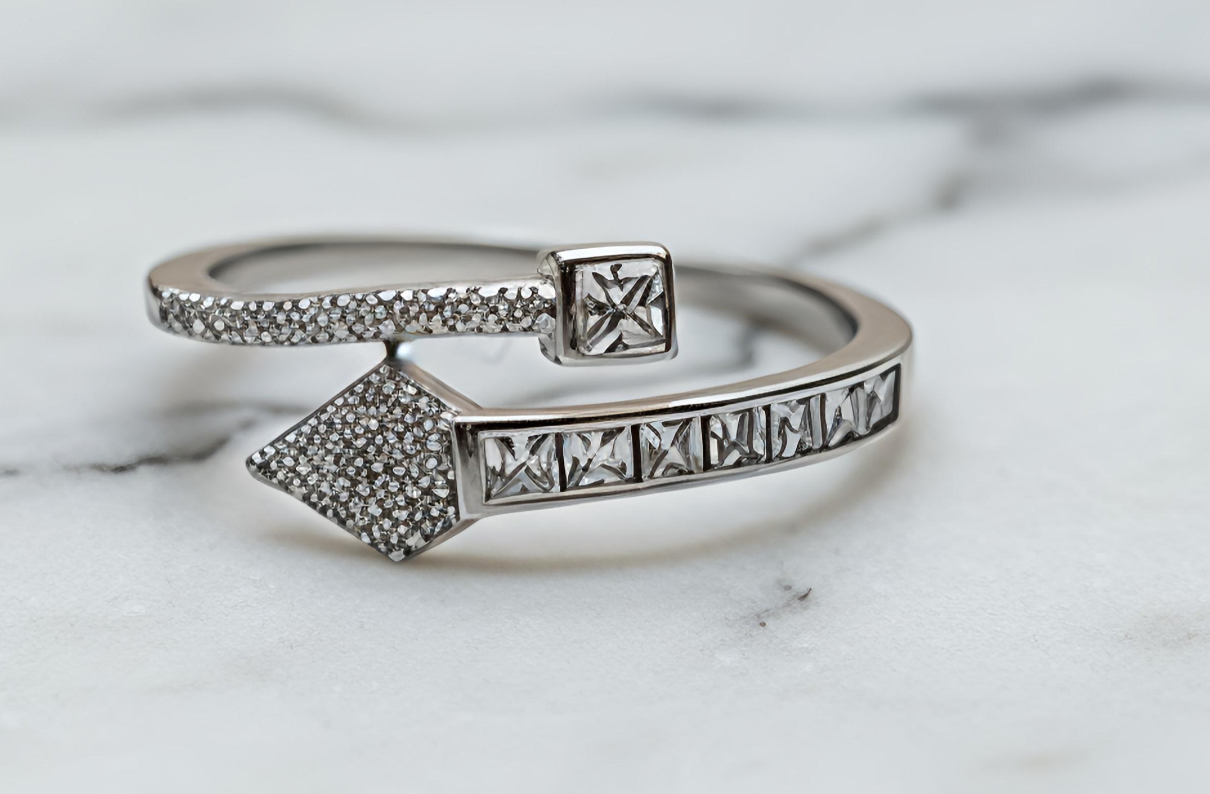 Make a bold statement with this uniquely designed adjustable ring. Crafted from authentic 92.5 Sterling Silver, the piece features a creative dual-band aesthetic. One side showcases an intricate pavé-set geometric arrow design, while the other is adorned with rows of brilliant, channel-set crystals ending in a striking square motif. Its adjustable open-back design ensures a perfect fit for any finger, making it as functional as it is beautiful.