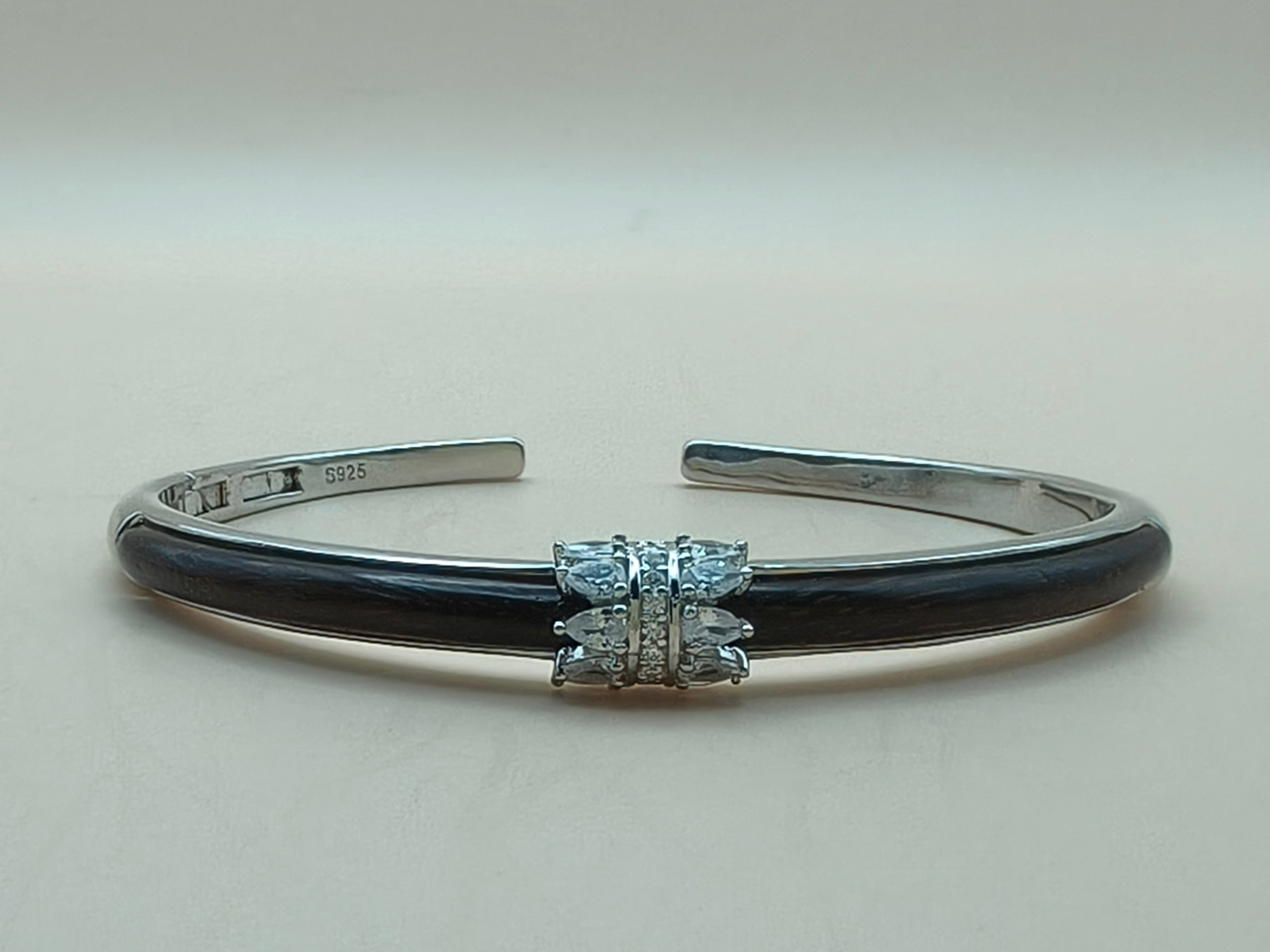 Elevate your style with this stunning silver cuff bracelet, featuring a sleek black inlay and a sparkling crystal center. Designed for the modern woman, this piece blends sophistication with everyday practicality.