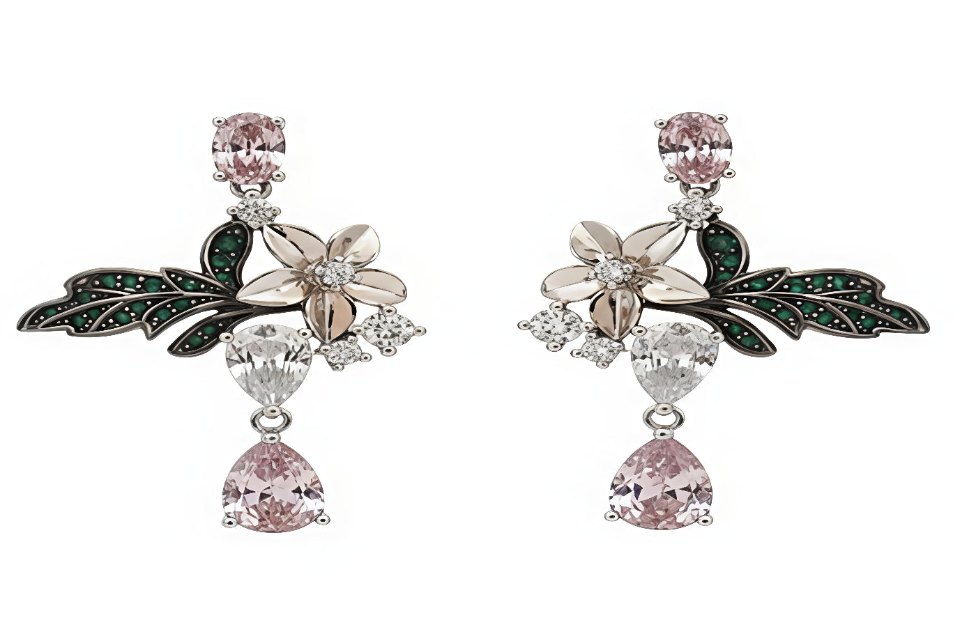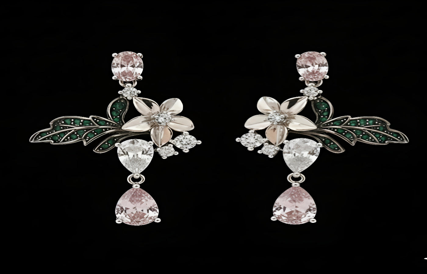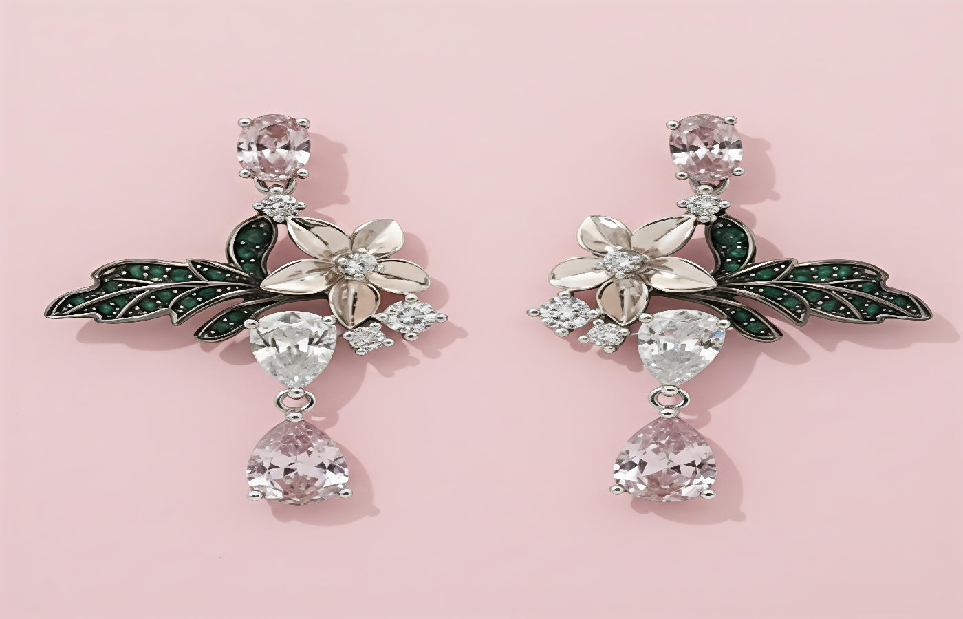 Close-up of a woman wearing a decorative earring with a dark backgroundPair of floral earrings with pink gemstones on a black backgroundPair of ornate earrings with floral and leaf designs on a pink backgroundPair of floral earrings with pink gemstones on a white backgroundOrisil Jewels certificate of authenticity on a dark surface