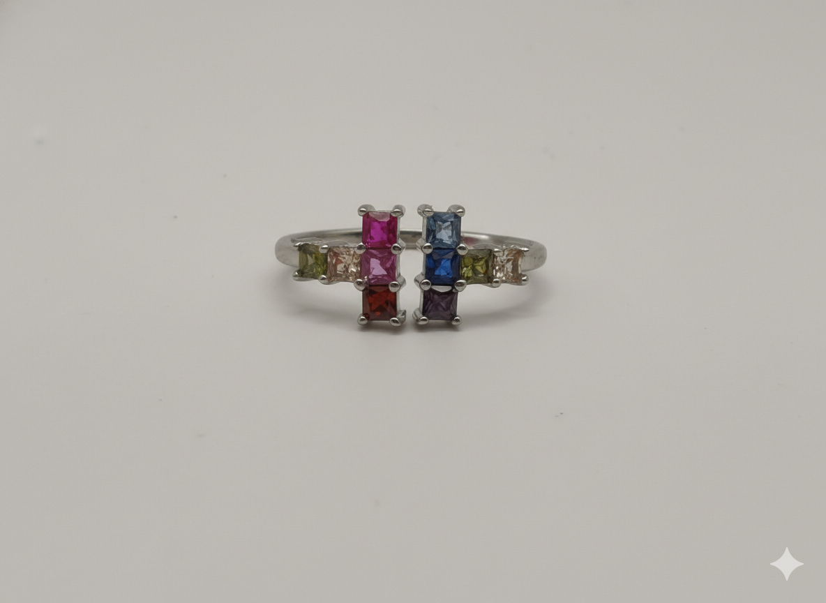 Vibrant Design: The ring showcases two vertical columns of square-cut gemstones in a rainbow of colors, including deep pink, sapphire blue, emerald green, and rich red.