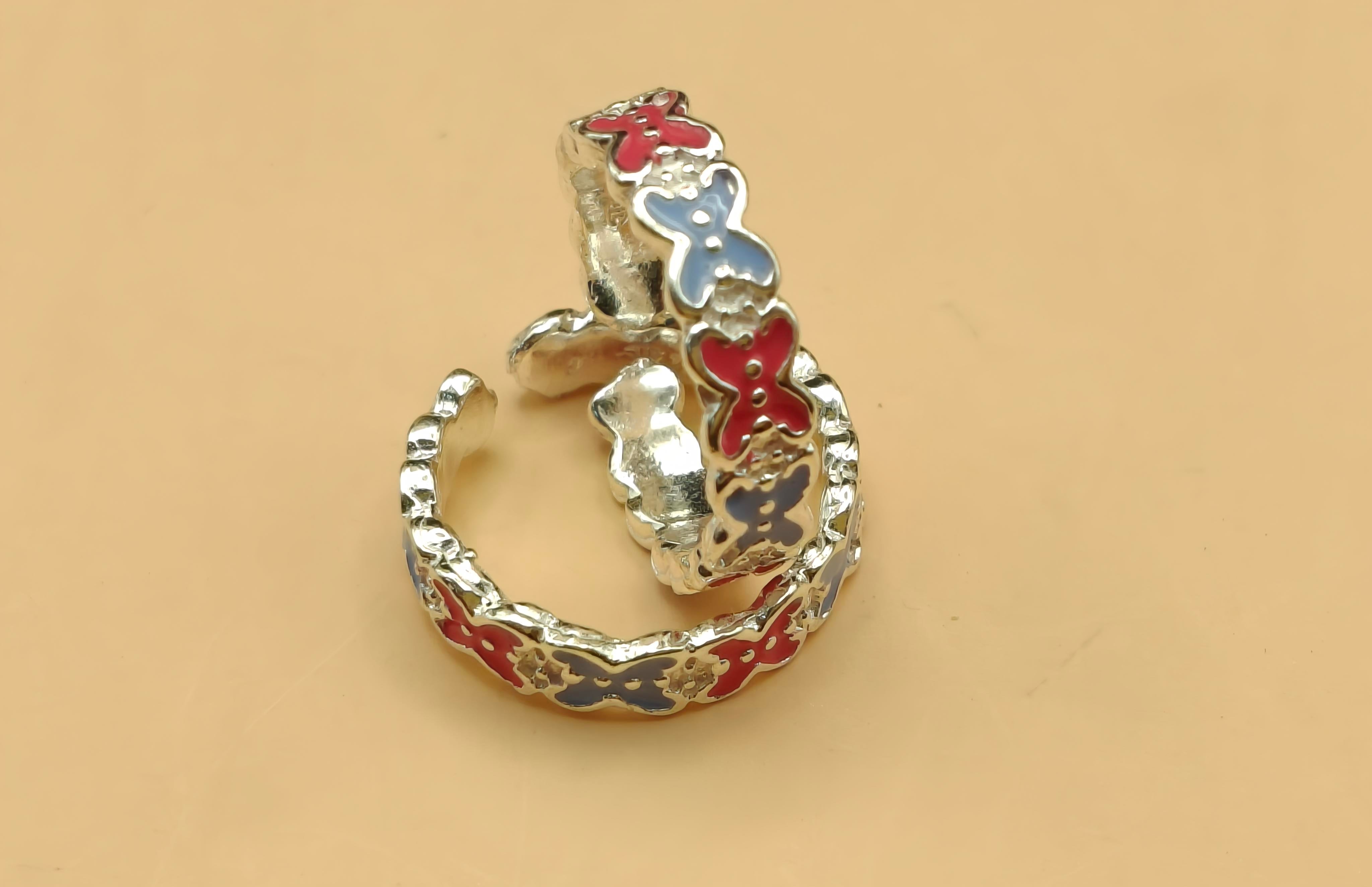 Add a playful yet elegant charm to your feet with these beautifully crafted butterfly toe rings. Made from premium 92.5 Sterling Silver, this pair features a continuous band of delicate butterfly motifs detailed with vibrant red and blue enamel, accented by sparkling crystals for a touch of radiance.