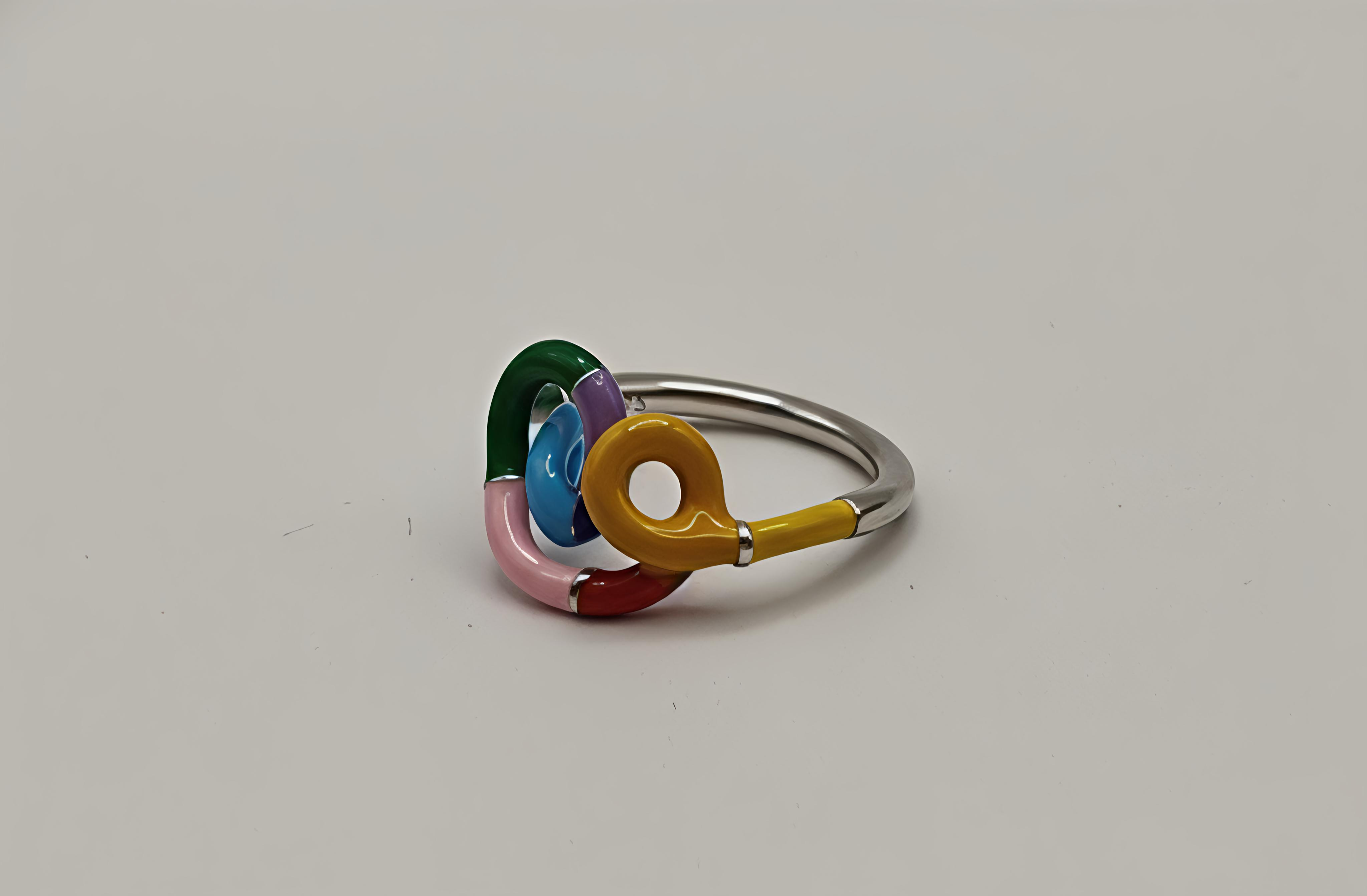 This stylish ring features a unique, intertwined knot design accented with vibrant multi-colored enamel. Its modern aesthetic makes it a perfect statement piece for any jewelry collection.